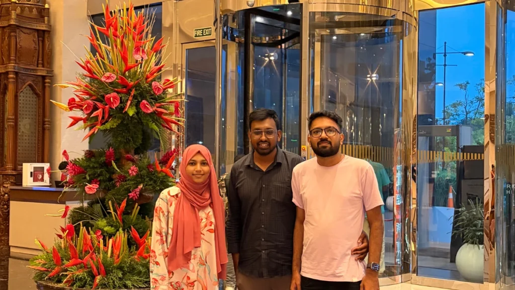One of the nicest parts of the day was meeting my friend Adeeb, who’s been living in Japan for the last eight years & working for Toyota. We first met online while working on a Dark Web Monitoring Tool for Kerala Police Cyberdome, and since then we’ve somehow never missed meeting whenever he’s in India. This time, the meetup itself became our meeting spot. He travelled all the way from Trivandrum and later joined me and my sister for lunch at the Marriott. He also mentors her, so it felt good for all of us to sit together.